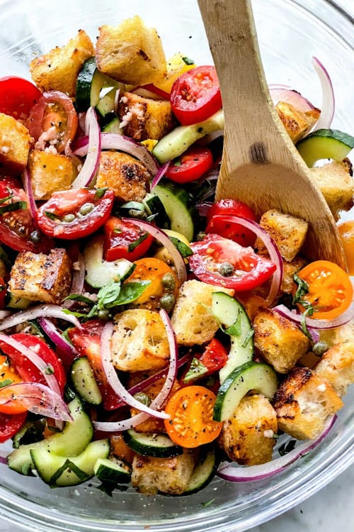 Panzanella is often overlooked for a Caesar or other kind of salad, but it deserves its day in the spotlight. Look how beautiful it is! Foodie Crush’s recipe marries fresh tomatoes and cucumbers with slivers of red onion, bread, capers, and a simple yet delicious vinaigrette.