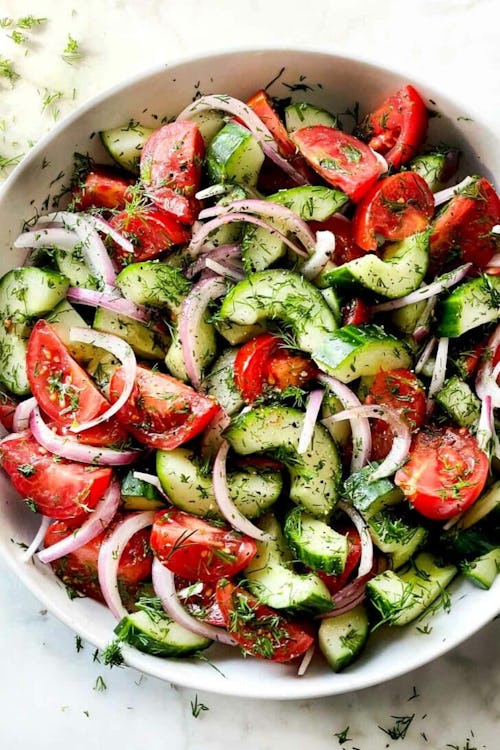 Want something fresh to serve alongside all the hot dishes, or maybe a side dish that doesn’t require any cooking at all? Foodie Crush’s classic cucumber and tomato salad is onion-y and herby, and adds a nice light element to break up all the cheese- and butter-heavy offerings on the table.