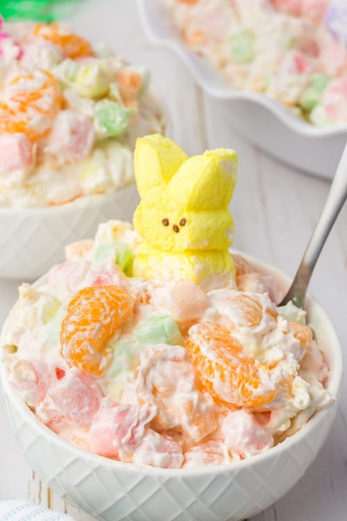 The Watergate, ambrosia, and Jell-O salads of the world always spark debate about whether they’re a side or a dessert, but I’m from the South, where a dish like this would sit right between the green beans and the mac and cheese. Princess Pinky Girl’s fruit fluff is easy to make and super cute to serve with some Easter Peeps perched on top.
