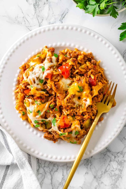 Spend about 15 minutes browning ground beef, softening up some onions in a skillet, and boiling pasta. Then just assemble and bake your flavorful hamburger casserole dinner, courtesy of Simply LaKita. This one will end up in your rotation of faves.