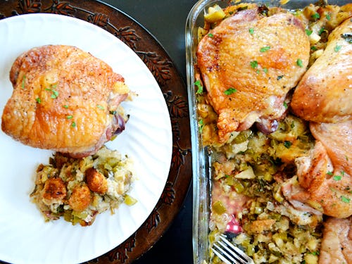 If you’re making Thanksgiving for two (or just a few), why make an entire turkey? Budget Bytes’ turkey casserole recipe includes whole turkey breasts and legs on top of a delicious stuffing. It takes a while to bake and some attention halfway through, but for Thanksgiving dinner to be ready in two hours, this qualifies as an easy casserole recipe.