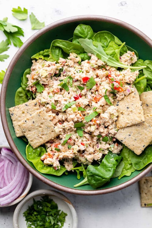All The Healthy Things’ easy salmon salad is such a simple, fresh way to transform canned salmon into a really great lunch. With plenty of celery, bell pepper, and red onion for flavor and crunch, this would be so good served with crackers, on a sandwich, or inside a wrap.