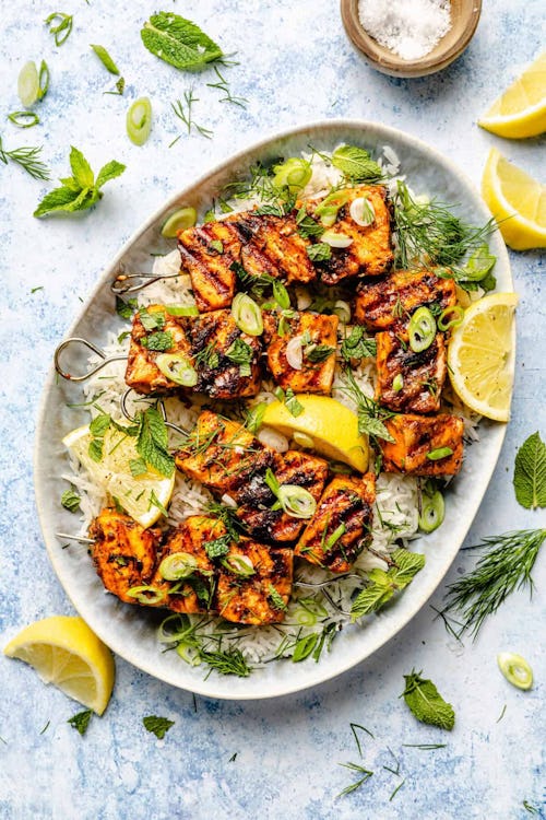 Fans of harissa and Mediterranean flavors will love All The Healthy Things’ marinated salmon recipe. The marinade does all the work of infusing lemon and harissa flavors into the fish, which you then grill outside or on a grill pan, and serve over cilantro lime rice.
