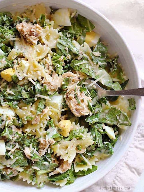 If you have leftover kale and salmon, you could make these Caesar salads from Budget Bytes for lunch. They’re beefed up with a little farfalle pasta and egg, so it’s perfect if you have protein goals to meet and need to stay full ‘til dinner time.