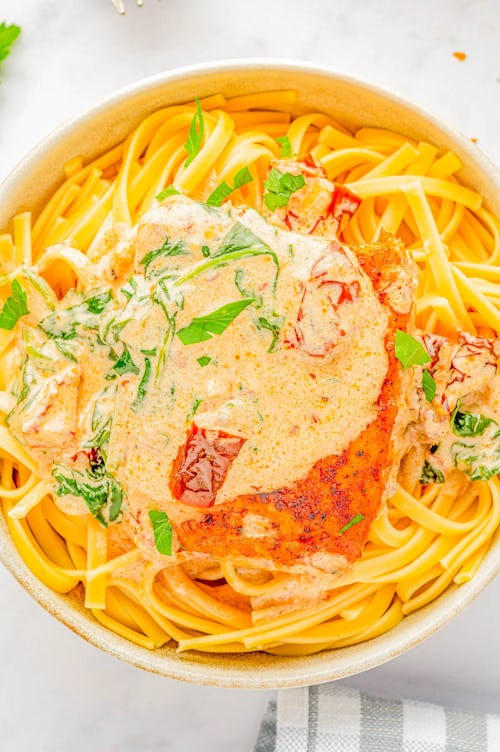 In the mood for something a little richer? Then you need Averie Cooks’ creamy garlic butter Tuscan salmon, which is best served on a bed of linguine. Since the fish is the star of the meal, Averie recommends using a fresh filet from the butcher case at your local grocery store over frozen fish.