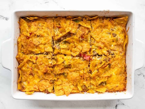 This sausage breakfast casserole from Budget Bytes doesn’t have any of the fall flavors like apple orcinnamonor pumpkin, but it is super easy to throw together and loaded up with all the things you want on a crisp fall morning — sausage, eggs, cheese, and even tortilla chips. Using frozen veggies, you can make this a fast breakfast to throw together, and it makes for gorgeous leftovers.