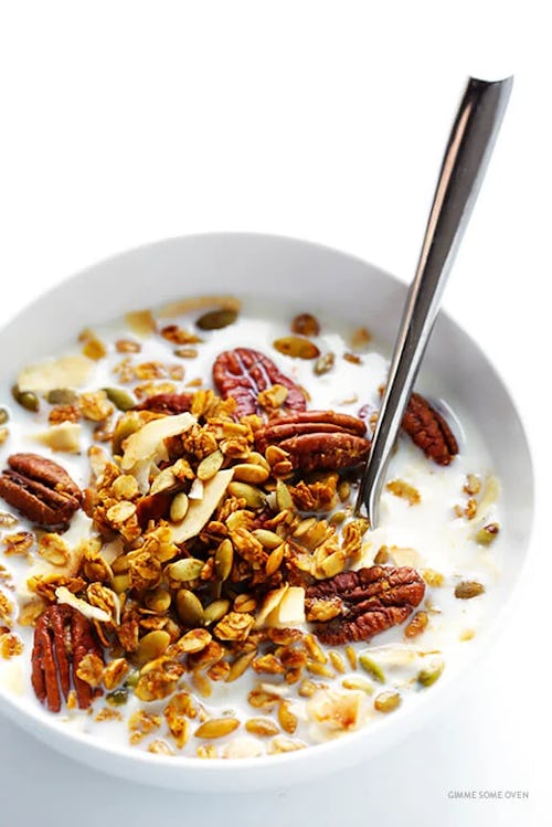 Homemade granola is one of those things that makes you feel really fancy, but it’s literally so easy to whip up. This recipe for pumpkin spice granola from Gimme Some Oven includes all your favorite fall flavors plus plenty of crunch with the pecans, pepitas, and toasted rolled oats. Just throw everything together and bake, and you can use it to top yogurt, eat with milk, or just grab a handful as you’re running out the door. It’s great for those busy mornings when you really need something to give you energy for the rest of the day.