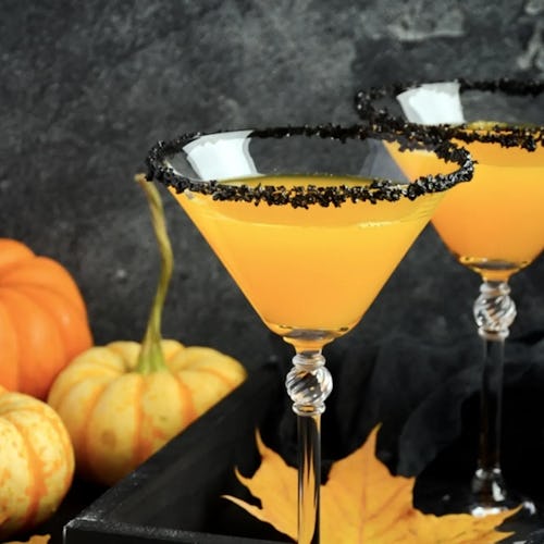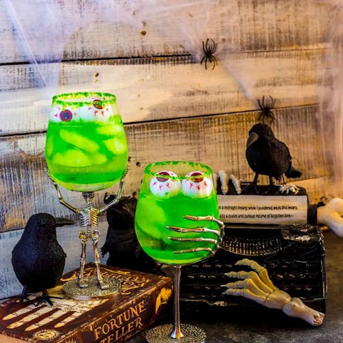 Halloween cocktails are seriously so fun. You can serve them in pumpkin-shaped glassware, stir in some edible glitter so they look like real-life potions, or give them a Pop Rocks rim if you so choose. All bets are off, and everything is fair game. If you can add a fun or freaky garnish, you simply must, because it’s what spooky season is for. And luckily, there are a ton of really easy fall drink recipes out there. Apple cider is the base for so many yummy autumnal drinks, like mimosas and sangrias, to say nothing of a hot spiked cider on a chilly night. Because of its burnt orange color, it’s automatically even more festive when served in Halloween glassware.