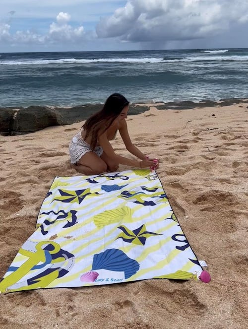“There is nothing more annoying than having to readjust your beach blanket or towel every five seconds, and then all of a sudden the blanket (and everything on it) is covered in sand! The Lay N Stay blanket comes with adorable seashell stakes to help your blanket stay put. Plus, there are so many cute colors and patterns to choose from.” — Katie Garrity