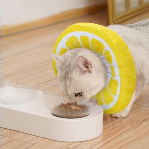 A Fruity Cat Cone Collar That Can Easily Be Adjusted