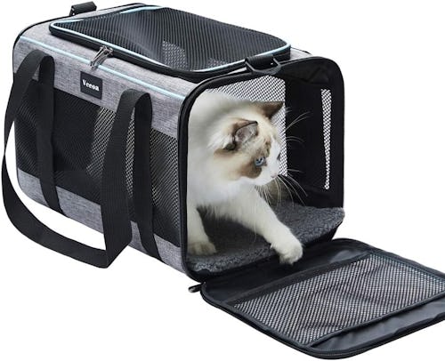 Designed with mesh windows, this pet carrier will ensure that your cat is comfortable and ventilated. It features a top and side entry with locking zippers, carrying handles, and an adjustable shoulder strap that can double as a seatbelt, so putting your cat in the carrier and then transporting them will be a bit easier. It also has a back strap that allows you to strap it onto your luggage. And, it has a removable fleece bed so your cat will feel warm and cozy. It’s no wonder it has a 4.8-star rating on Amazon.