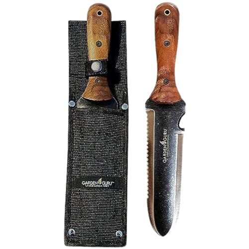 Garden Guru Hori Hori Gardening Knife for Weeding Digging Pruning & Cultivating – Stainless Steel Full Tang Blade | Walnut Wood Handle | Marks for Measuring Planting Depth | Nylon Sheath for Storage