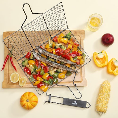 This stainless steel grill basket is an absolutely genius essential for firing up veggies, shrimp, and other small, loose foods that are at risk of falling through the grates. It opens up completely so you can easily add food and locks securely so it won’t open by accident. The handle can be detached and also rotates 360 degrees so you can flip it to make sure everything’s cooking evenly.
