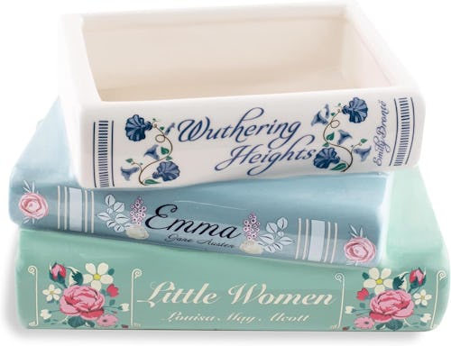 This planter looks like a stack of classic books for a pretty and fun twist on a traditional ceramic pot. The spines of the books feature delicate painted details while the back has a ribbed texture to replicate pages. It has a wide top opening and a drainage hole with a stopper at the bottom to make sure your plants are well hydrated.