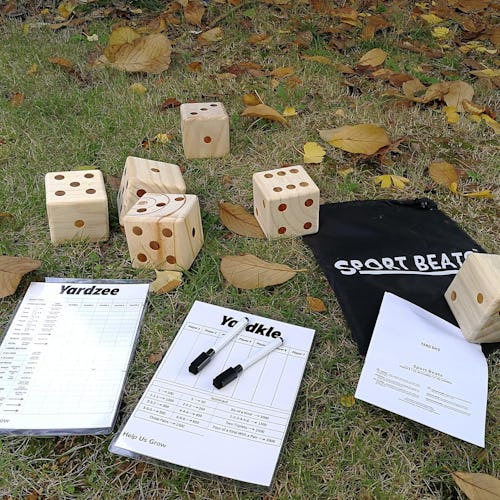 Play all kinds of popular games outdoors on a bigger scale with these giant wooden yard dice. The set comes with six dice, a carrying bag, and scorecards to play Yardkle, Yardzee, and whatever else you can dream of. Made of pine wood, the dice are 3.5 inches squared and feature smooth, rounded edges that effortlessly roll when you throw them.