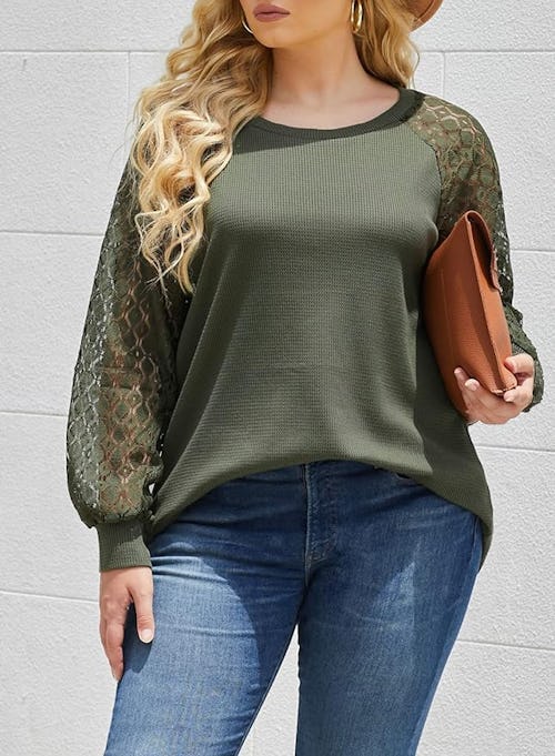 With gorgeous sheer lace balloon sleeves, this long-sleeve top is a demure, work-appropriate way to show just a hint of skin. The classic crewneck and waffle-knit texture make it a stylish and versatile piece that’s easy to dress up or down with a swap of bottoms and shoes.