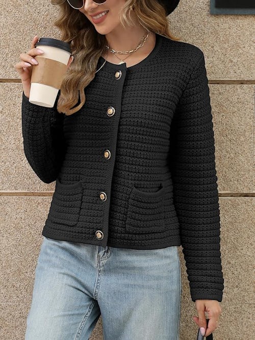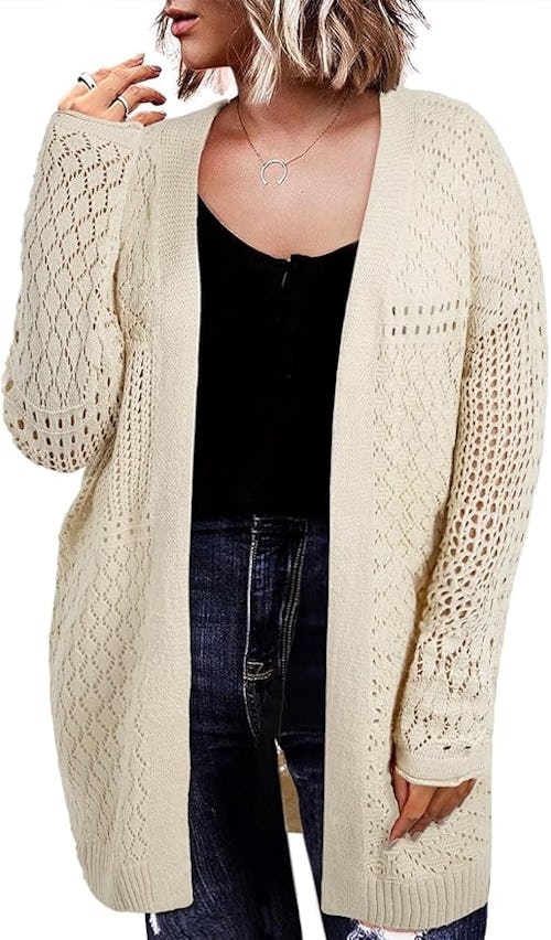 With its open front and hollowed-out crochet details, this cardigan beauty is ideal for breezy mornings and cold office days. Made from soft, lightweight acrylic, it features an open-front design that makes it easy to layer over anything from T-shirts to dresses. Available in multiple colors, it’s an easy way to add warmth and style to your cool-weather wardrobe.