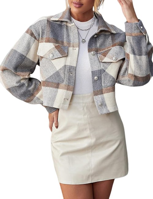 Cher Horowitz would absolutely rock this plaid shacket. The soft flannel fabric and stylish plaid pattern make it a great cool weather piece, with two big front pockets for your phone and essentials. Whether buttoned up or layered over a turtleneck, this cropped jacket will make your high-waist skirts and pants pop.