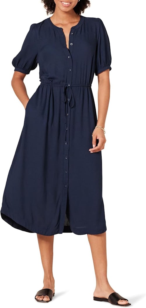 This everyday midi dress is designed to be comfortable without sacrificing style. Made from soft, breathable viscose, it has a beautiful drape and smooth finish that feels as good as it looks. An adjustable drawstring waist and puffed sleeve details make it a cute choice, and the pockets are a convenient bonus.