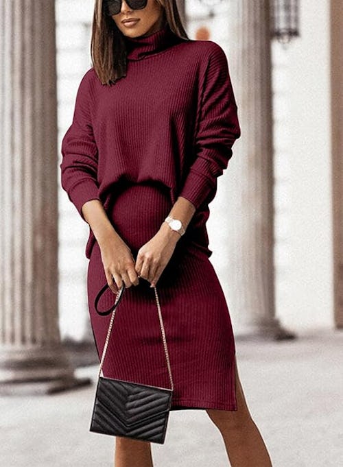 Combining a long sleeve turtleneck top with a bodycon midi skirt, this two-piece set is the epitome of effortless elegance. The soft fabric keeps you cozy while the skirt hugs without feeling too clingy. A high side slit adds just the right amount of allure. Poised to be a go-to for social events or nights out, this set ensures you look and feel your best.