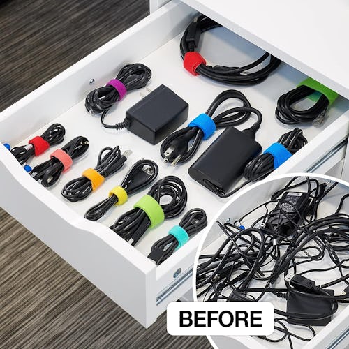 This multi-size pack of cable storage ties doesn’t just keep cords organized, it also makes finding the right one easier since it comes with a rainbow of colors. Each tie is crafted from durable nylon and features a self-sealing hook-and-loop closure. Use them for all kinds of wires, including tech chargers and small appliance cords.