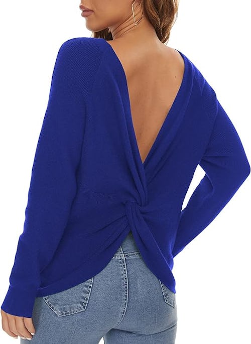 This sweater is beyond genius, because its plunging V cutout with a knotted bottom can be worn to show off your back or your front, making it super versatile. Beyond that fun detail, this sweater is super soft and cozy. It also has a subtle rib knit that’s so popular right now.