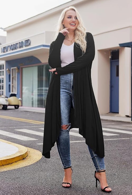 This open-front cardigan is a wardrobe essential that elevates outfits from casual to dressy. Close fitting at the sleeves, it cascades off the body with drape for days. The flowy cut, near maxi length and eye-catching high-low hem add stylish detail.