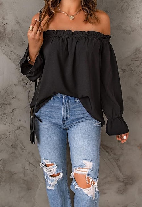 The top of this blouse is all glam, with a ruffled cut and shoulder-bearing design. But the rest of this garment is loose-fitting and oh-so-comfortable, with a flowy midsection and lantern sleeves. Despite the shirt’s long-sleeved design, reviewers noted that it’s lightweight so it’s suitable for year-round wear.