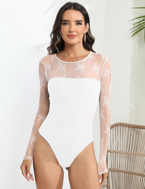 The sheer, lacy sleeves of this bodysuit give a subtle peek of skin, while the inner layer offers full, non-see-through coverage. There are two snap closures at the crotch for easy on/off, and full butt coverage makes this a solid choice for those who don’t fancy a thong cut.