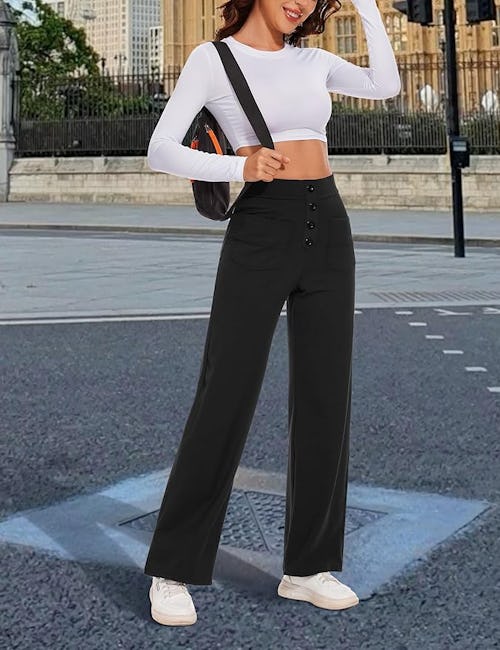 Whether it’s the on-trend wide legs, the high waist, or the unique button details, these pants exude casual cool. A highly stretchy yoga-pant material ensures they feel as good as they look, while a relaxed fit through the hip and thighs gives plenty of room for movement.