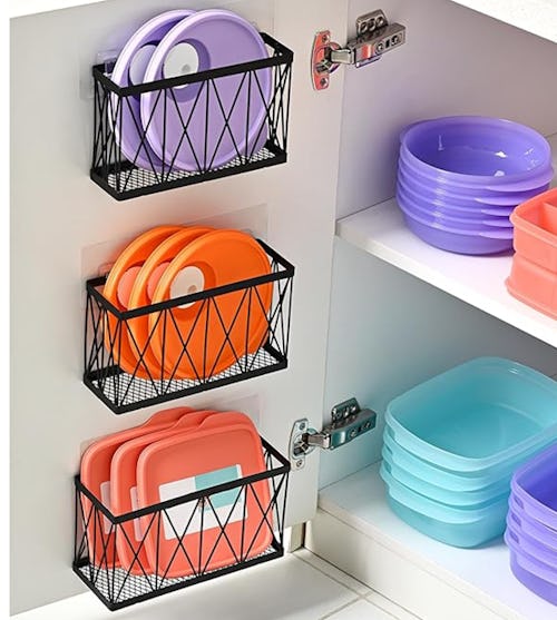 Stop searching through piles of food container lids to find the right one, instead get this highly rated set of affordable cabinet door storage organizers. They’re made from lightweight yet durable stainless steel and are ultra-easy to install when you use the included adhesive strips. The set includes three bins, offering space for lids, snacks, cleaning products, and more.