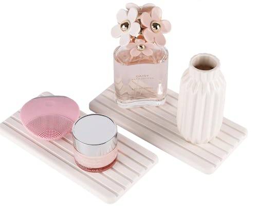 These modern stone coasters keep surfaces dry while adding a chic touch to any space. Use them in the kitchen to store sponges, as coasters for beverages, and beyond. The natural diatomite material quickly and effectively absorbs water for a dry surface in seconds. Plus, they come with anti-skid feet to help keep them securely in place.