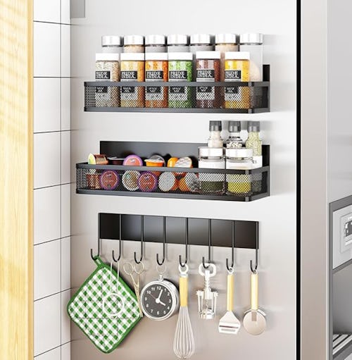 Take advantage of the space on the side of your fridge with this magnetic shelf set. It includes a small and large shelf with a railed edge to keep items from falling, as well as a hook rack for hanging oven mitts, towels, utensils, and more. Each magnetic piece is constructed from durable stainless steel and can support between 4 and 11 pounds of weight.