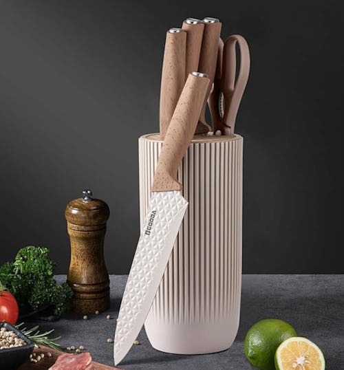 It’s not often you find an aesthetic knife set but this one delivers the vibe with its neutral beige hue and wood grain detail — plus a great price. But it’s not just nice to look at, it also works so well, thanks to ultra-sharp diamond texture blades, ergonomic handles, and a universal knife block with a stylish fluted design.