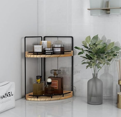 This corner-unit vanity organizer has a rustic meets modern design that you’ll be proud to display. It features two wood tiers and a durable metal frame and railings. Use it to organize your toiletries on your countertop for a tidy but accessible solution. Available in multiple colors to best match your space.