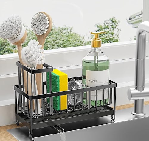 This sink caddy has so many must-have features that it’s no surprise it has a nearly perfect rating. It’s made from durable stainless steel that’s sturdy and rust-proof. And it features adjustable divided compartments and a removable basket so you can effortlessly organize and store your essentials. Plus, it has a rotating drainage spout underneath the drip tray, so you can set it up in multiple ways and always have it drip into the sink.