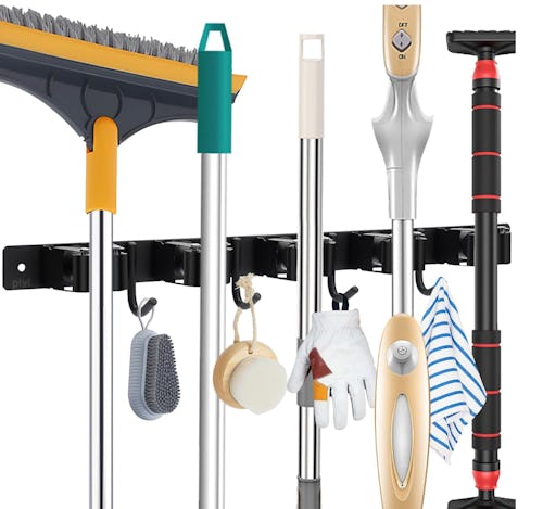 Organize your utility closet with this highly rated and super-affordable broom holder. It mounts to walls to keep tools off the ground and features five rubberized slots to keep handles securely in place. Integrated hooks provide extra storage for things like garden gloves, rags, and cleaning brushes.