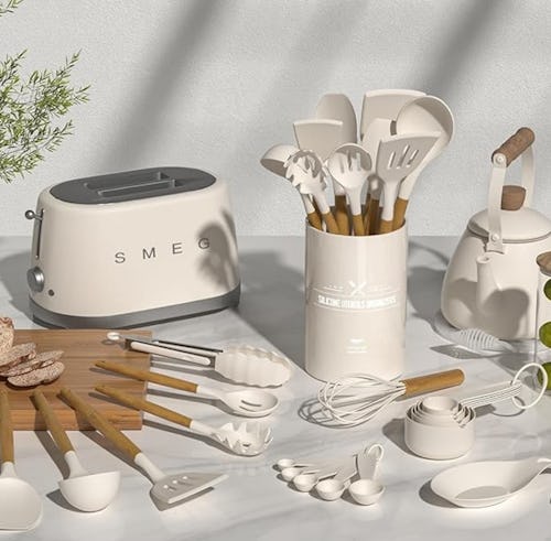 If you’re ready for an easy and affordable kitchen upgrade, then it’s time to clear out all your mismatched utensils and upgrade to this aesthetic set. This ultimate utensil set features a wood-on-khaki color scheme with silicone tips that looks so chic. And it comes with 33 pieces, including a spoon rest, measuring cups and spoons, and even a utensil crock for storing all of the utensils.