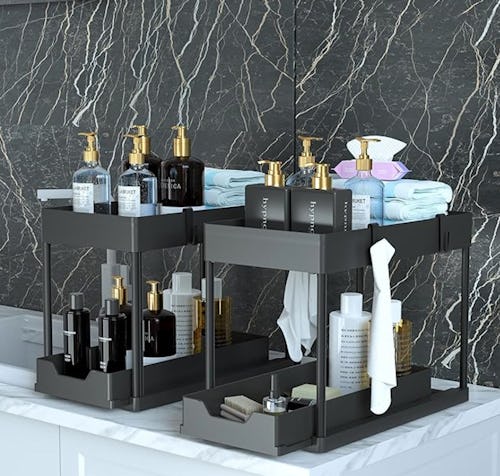 Tidy up your under-sink cabinets (or countertops) with this affordable two-pack of tiered organizers. They feature sturdy reinforced frames and pull-out drawers with a cut-out design for both easy access and increased airflow. The set includes bonus hooks that are perfect for hanging linens and small tools.