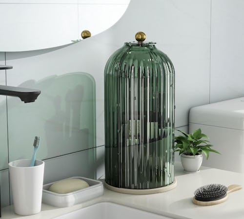This beautiful rotating container is actually a makeup brush holder. Underneath its dustproof cover are three separate sections to organize your tools. It’s available in black, green, pink, and beige in the listing.