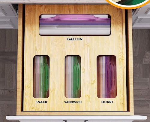 No more digging through crinkly chaos when you need to store leftovers — now you can organize your plastic bags in a convenient but still stylish way. This bamboo drawer organizer has four labeled slots that neatly store all your baggies — from gallon to snack size. The organizer comes fully assembled and includes 21 label stickers so you can customize it for your household needs.