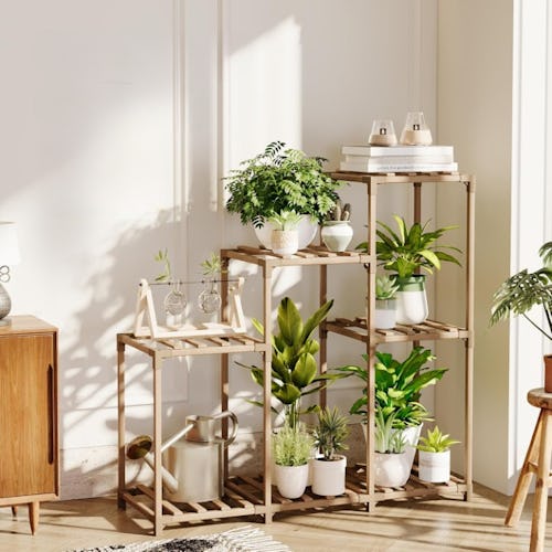 This wooden plant stand has a minimalist design that accents any room decor while letting your plants be the star of the show. It has space for more than seven pots, and is the perfect perch for everything from succulents to snake plants. Made from carbonized eucalyptus wood and reinforced with plastic joints, it’s stable and water resistant for indoor or outdoor use. The ladder design helps each plant get its share of sunlight, and it’s made to be simple to assemble with no screws required.
