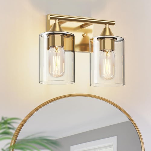 This brushed gold vanity light is the jewelry your wall’s been waiting for. Its thick glass shades and durable metal base add shine and functionality, whether you install it above your mirror or beside it. Available in three finishes, the light is compatible with dimmer switches and can be mounted facing up or down to suit your style.