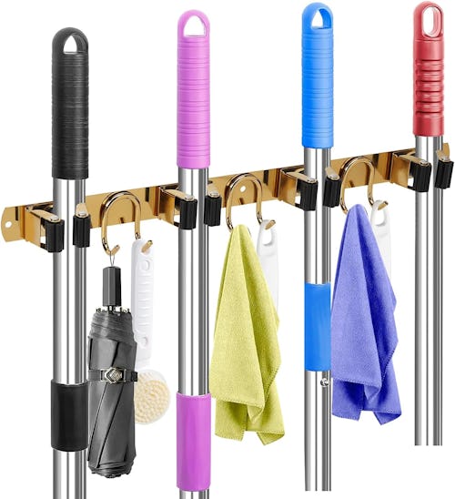 This is your sign to organize that chaos of leaning brooms and tangled mops you have hiding in a closet or garage or basement. With four slots and six hooks, this gold wall-mounted mop holder turns your cleaning corner into a glam, super-efficient setup. Made from stainless steel, the rack is strong enough to hold up to 55 pounds. It also comes in black or silver.