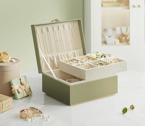 This chic jewelry box makes looking at your accessories feel like shopping your own boutique. The floating base, gold handle, and velvet interior bring serious aesthetic energy, while the layered compartments keep everything from rings to sunglasses perfectly sorted. Hooks, trays, and removable dividers make it easy to customize and keep your collection neat — and even easier to show off your taste. The box is available in six colors.