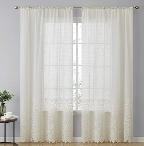 Soft light, subtle privacy, and a gorgeous lace pattern — these sheer curtains add a delicate flair to any room. The ombre effect fades into a macraméstyle design at the bottom, and the panels are light enough to let sunshine in while still giving your windows some coverage. The rod pocket design also makes the curtains easy to hang. You get two 84-inch panels in each set, and the curtains are available in five colors.