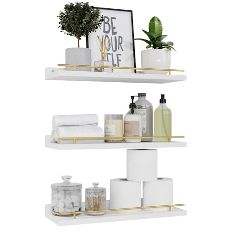 These white wood floating shelves are the definition of cute and functional. Each one holds up to 20 pounds and comes with a gold guardrail that adds flair while helping to keep your stuff from tumbling off. The pre-drilled holes and included hardware make them easy to install wherever you want to add a bit more storage. The shelves also come in gray, navy, and black.