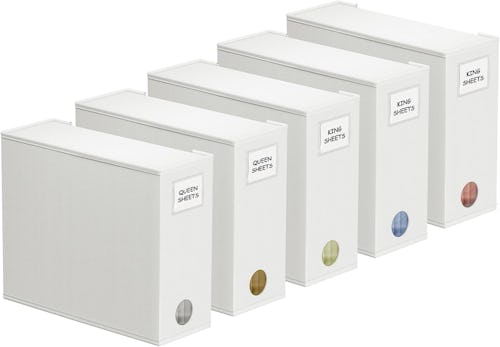 These foldable fabric sheet organizers turn messy piles of linens into neat, labeled stacks. Designed to hold a queen or king sheet set (including the duvet cover), each bin has a peek-through window so you don’t have to open them all to find the sheets you need. Plus, the included labels make sorting a breeze. The organizers come in four colors.
