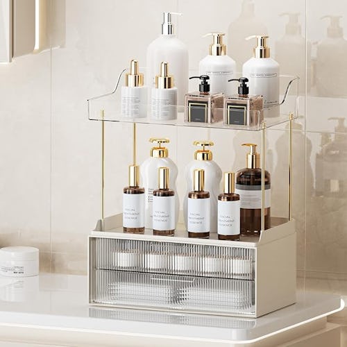 Your bathroom countertop will look so impressive when you use this posh organizer to store your toiletries and makeup. It has two roomy open tiers for easy access and two drawers with fluted fronts perfect for smaller items. And the gold-tone rods don’t just look expensive, but they’re also strong enough to securely support a ton of products.