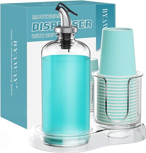 Keep your bathroom countertops looking sleek by clearing out toiletry packaging and upgrading to this budget-friendly mouthwash dispenser. The clear plastic and glass construction gives it an upscale, minimalist vibe while making it durable and easy to clean. Plus, the flip cap offers no-drip pouring, and it even has a built-in cupholder that’s ideal for 3-ounce cups.